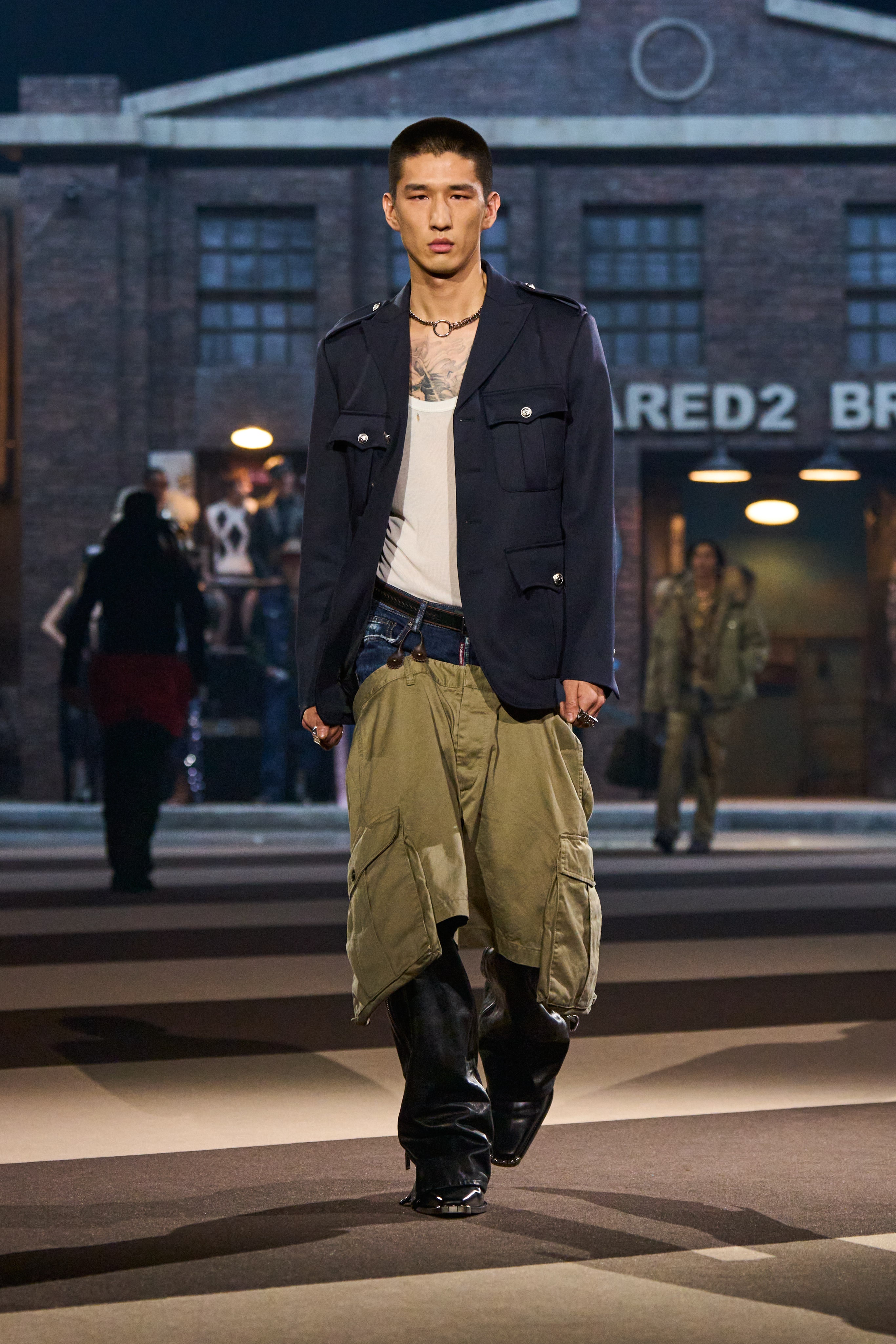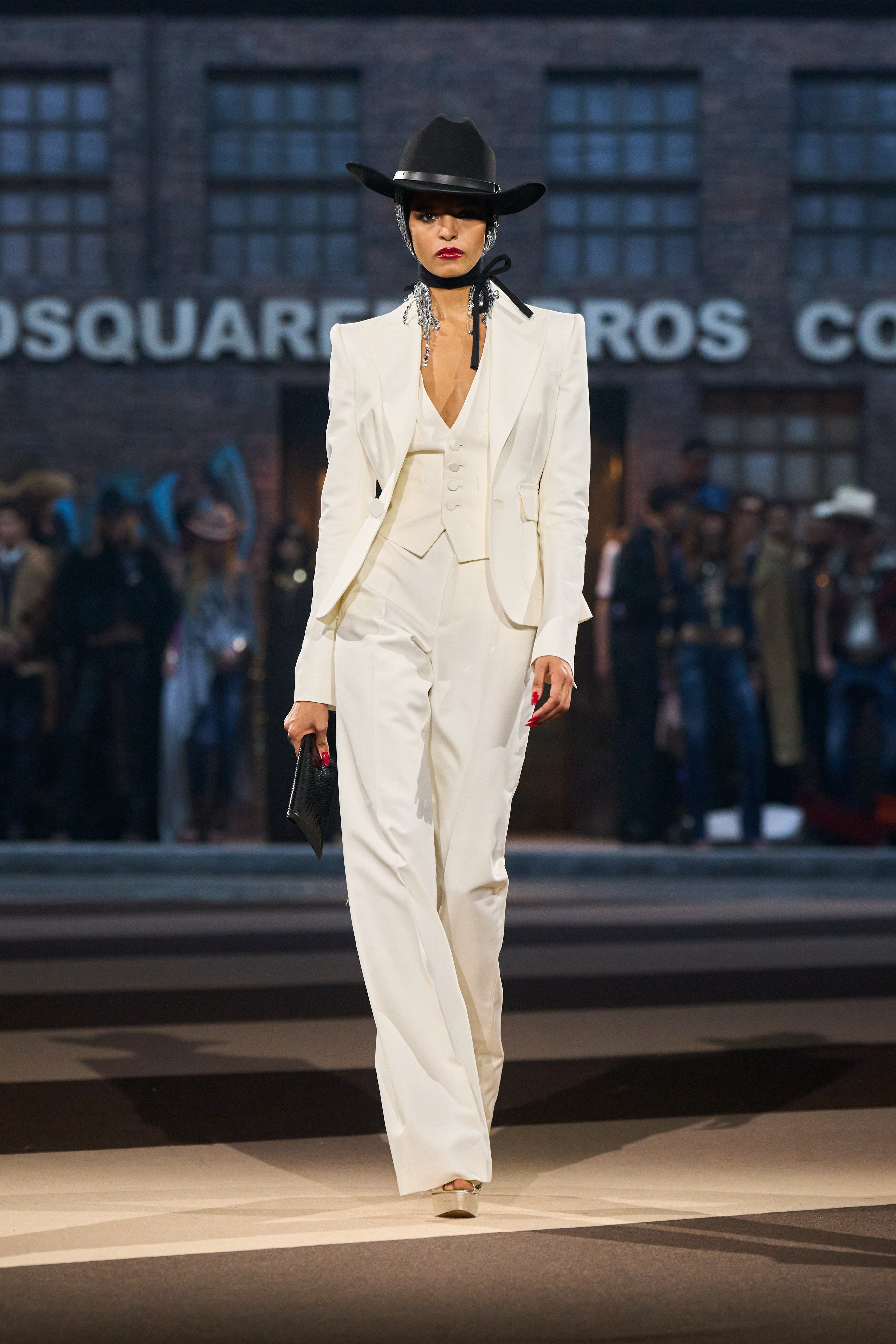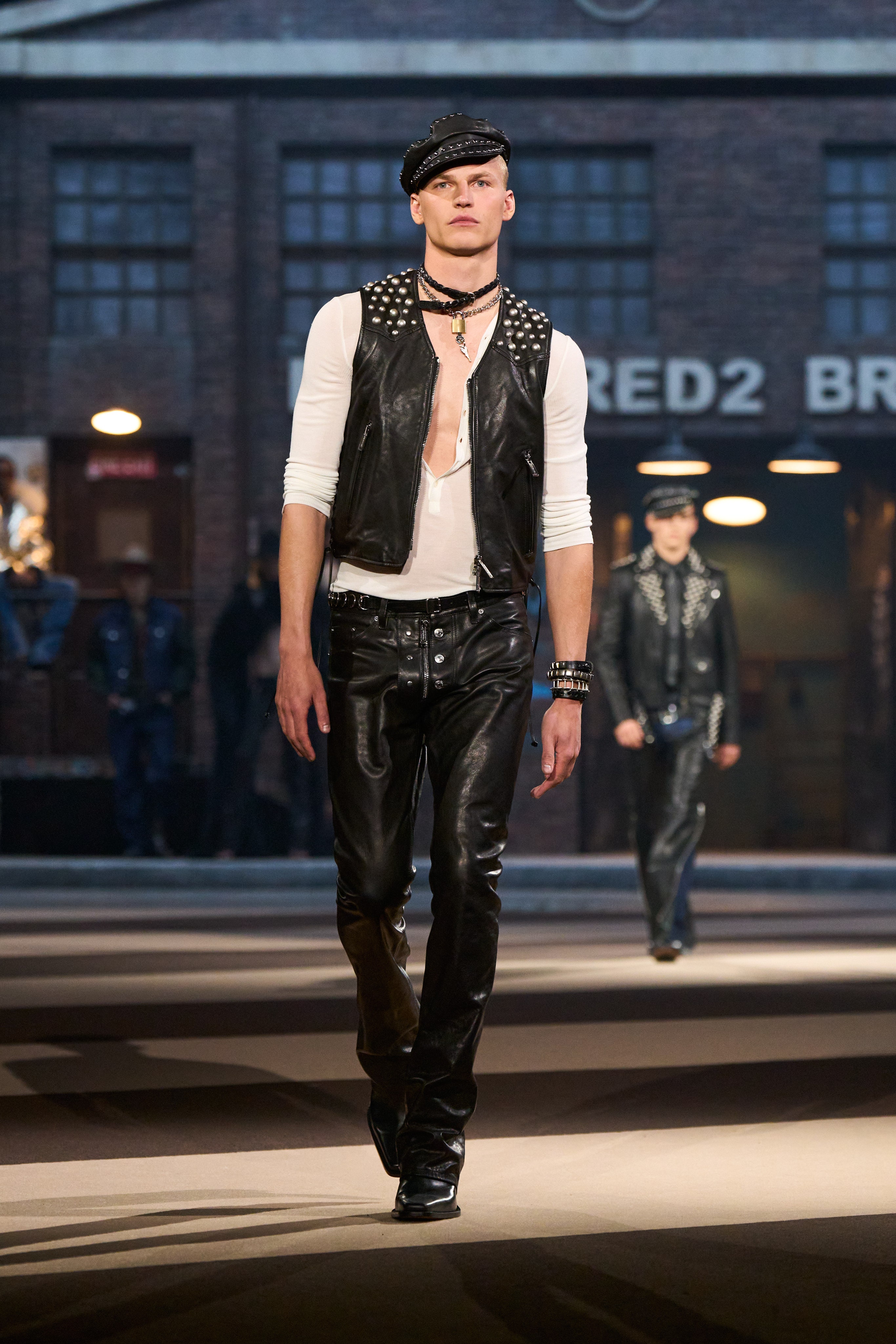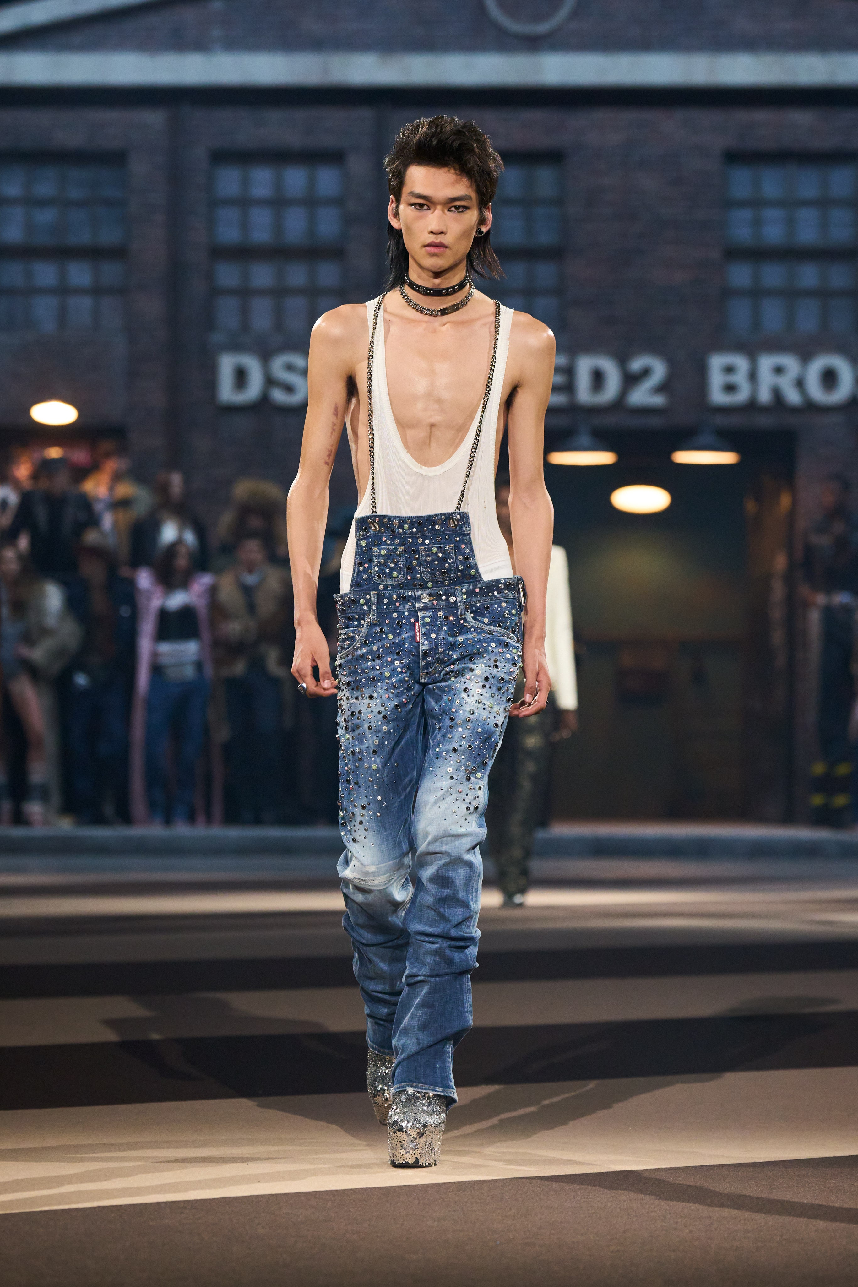 If the Catens aimed to make their 30th anniversary show unforgettable, they undeniably succeeded. The event was a vibrant spectacle—boisterous, outlandish, and unapologetically extravagant. The set ingeniously recreated a bustling New York street scene, complete with a procession of vintage limousines, pickup trucks, yellow cabs, and patrol cars, all unloading models in a high-octane cavalcade. Showgirls, leather-clad men, cowboys, hot cops, gym boys, adult film stars, and BDSM aficionados paraded through, embodying Dsquared²’s audacious and sexy ethos.