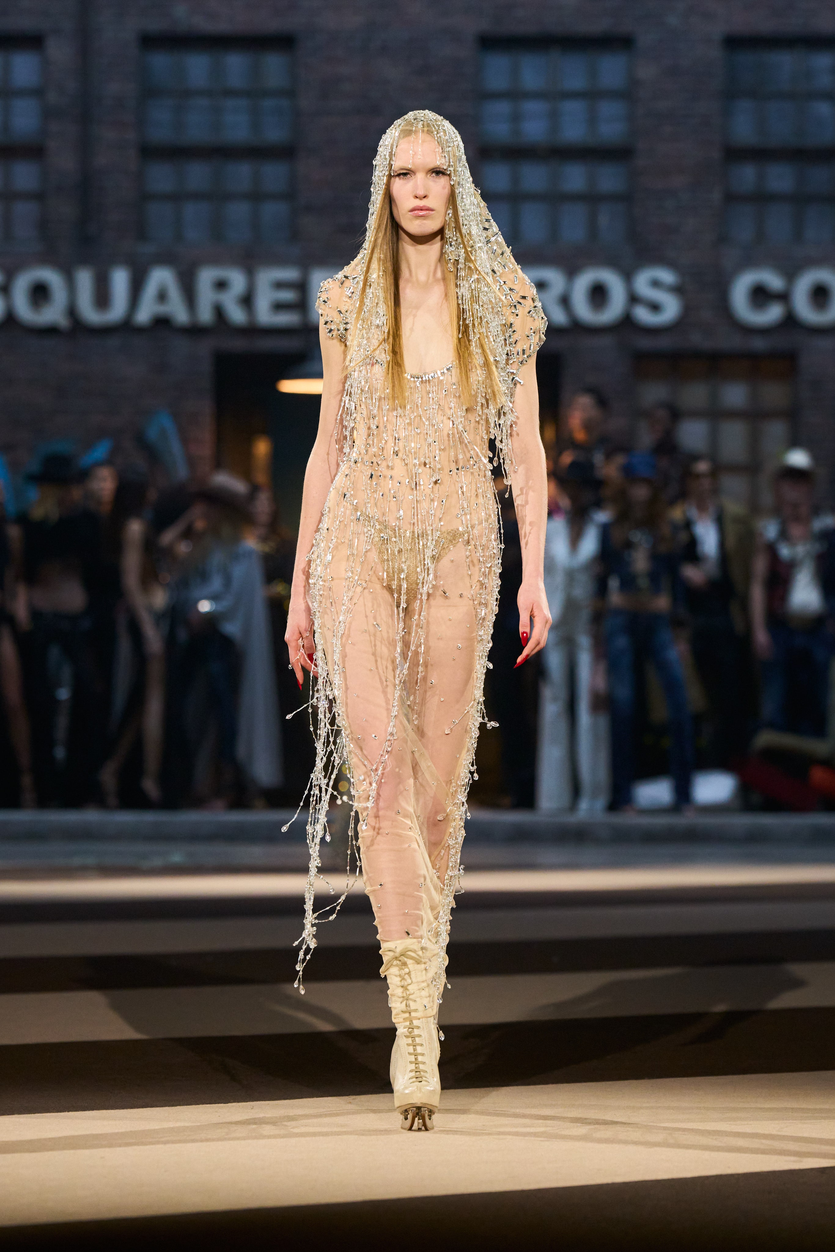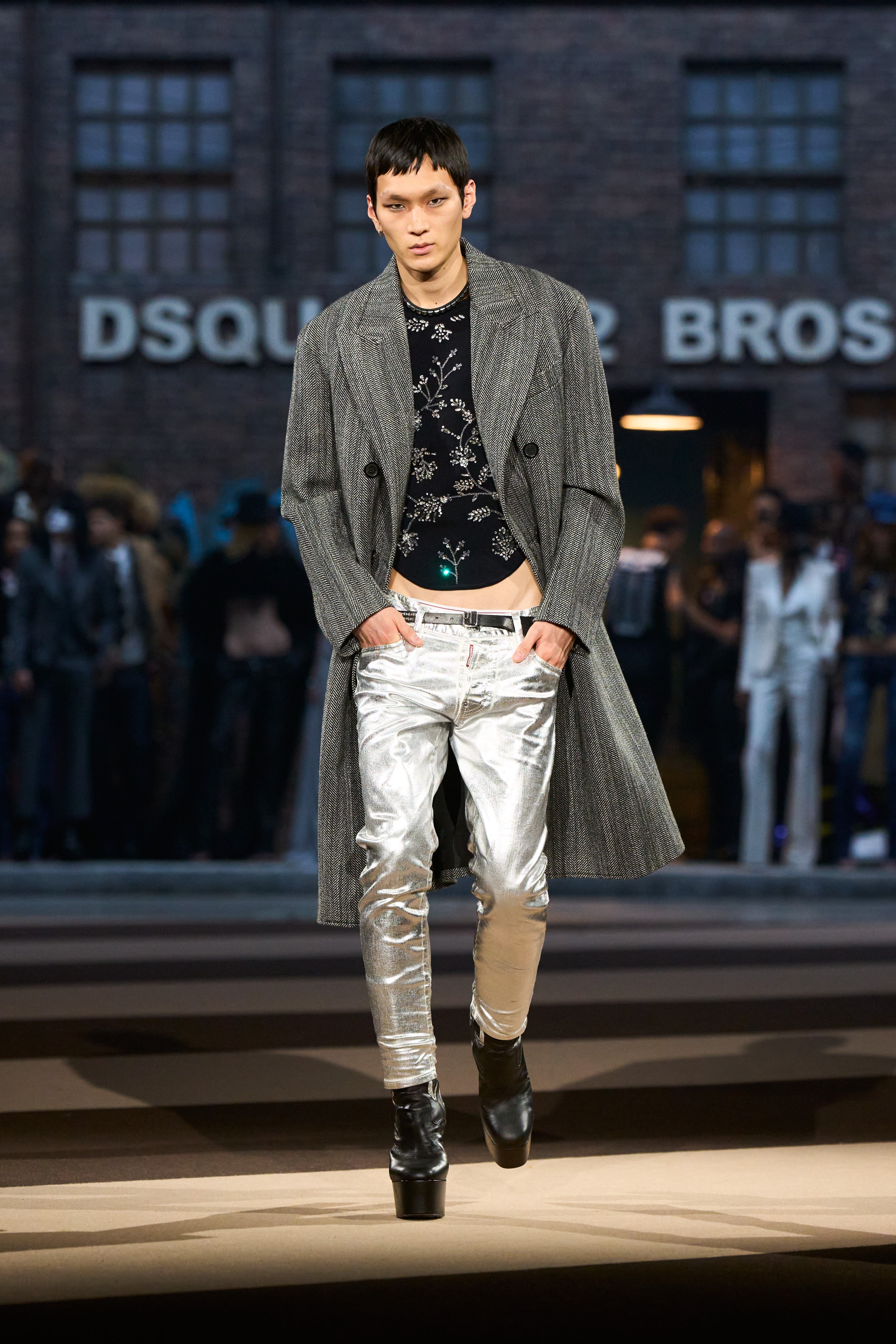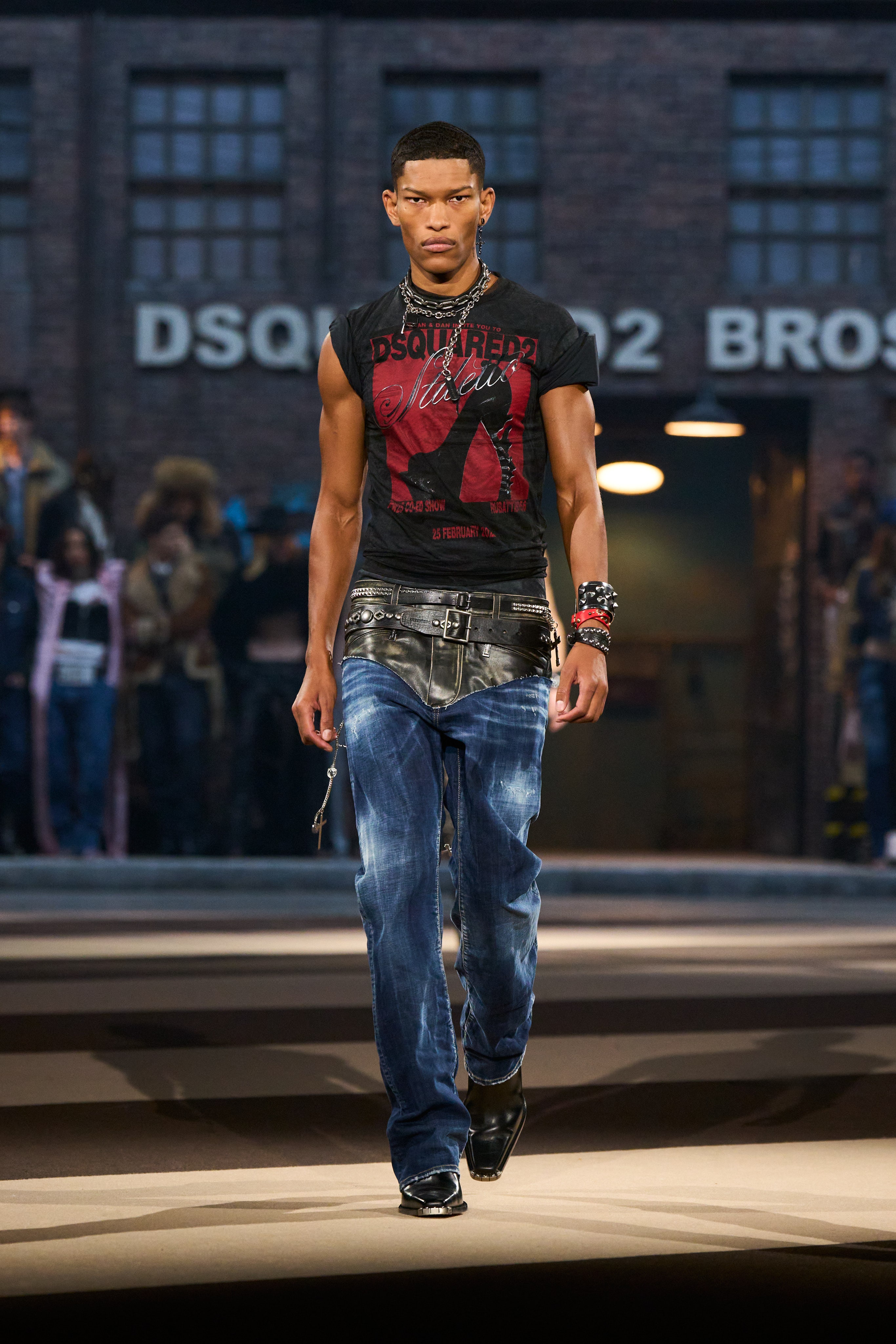 The Dsquared² entourage also included collaborations with Magliano, Vaquera, and Bettter—Julie Pelipas’s sustainable line—all welcomed into their archives to reimagine past designs, showcasing a spirit of generosity and shared creativity. The show was dedicated to Julie Enfield, a model and style muse who played a pivotal role in Dean and Dan’s journey. This dedication served as a deeply personal tribute that transcended the glitz, sex appeal, and theatrics, demonstrating that the Catens create with heartfelt intention.