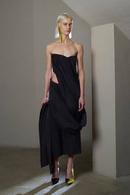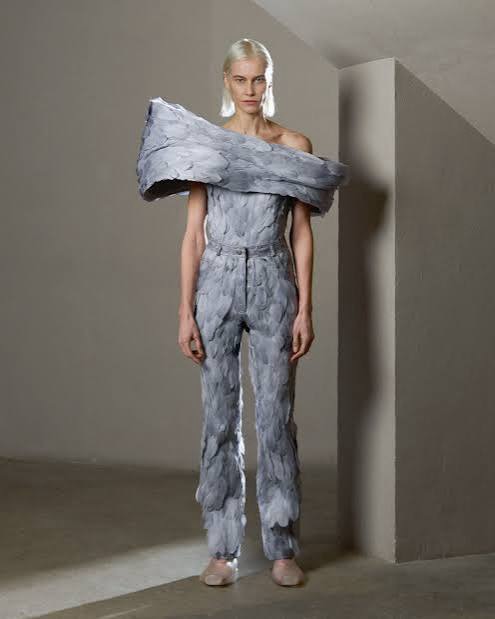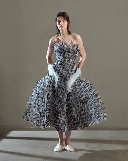 Theatricality remains a core directive, with movement choreographed as emotional propulsion. LùCHEN the designer translates weight into sculpture and air into expression, balancing the gravity of recycled matter with the fragility of real feathers to craft a cinematic tension. The runway becomes a stage for memory and intention, where every gesture writes into the collection’s larger narrative.