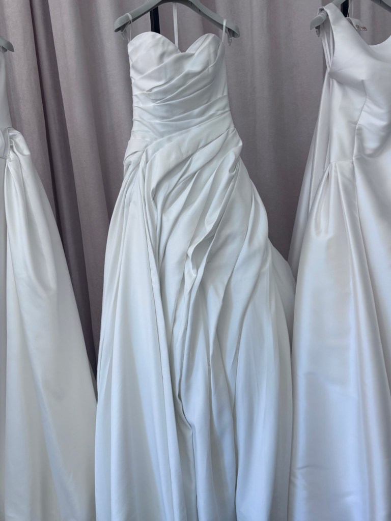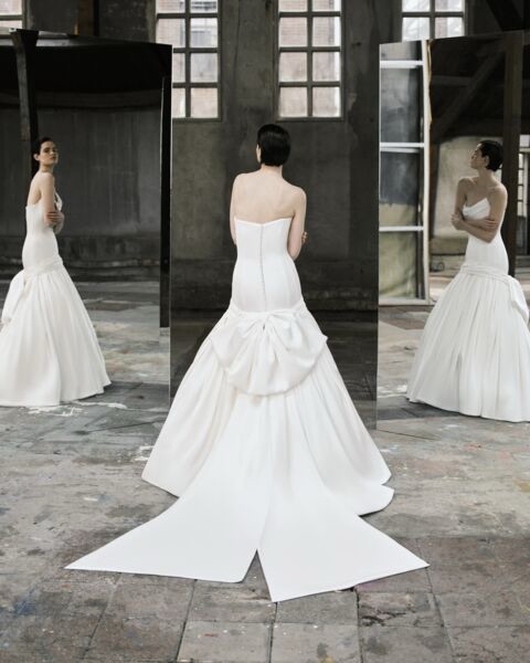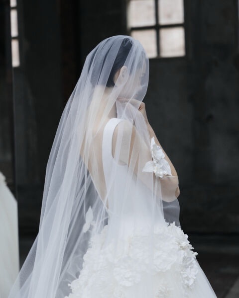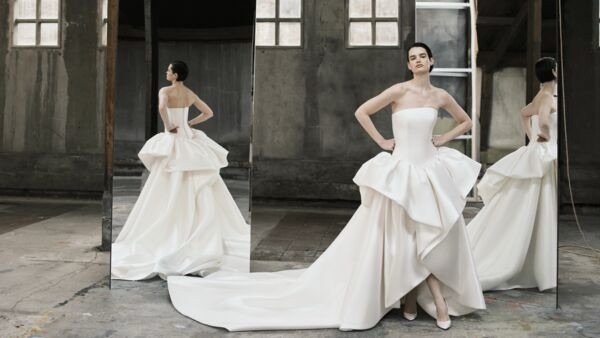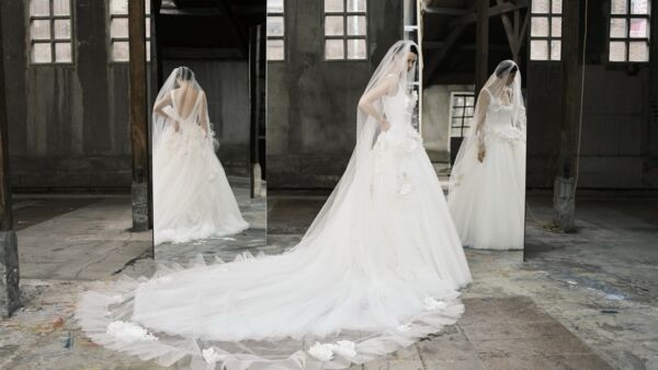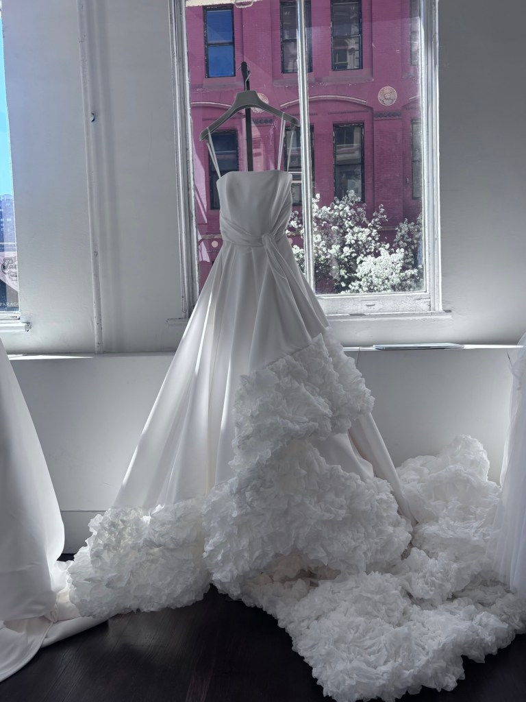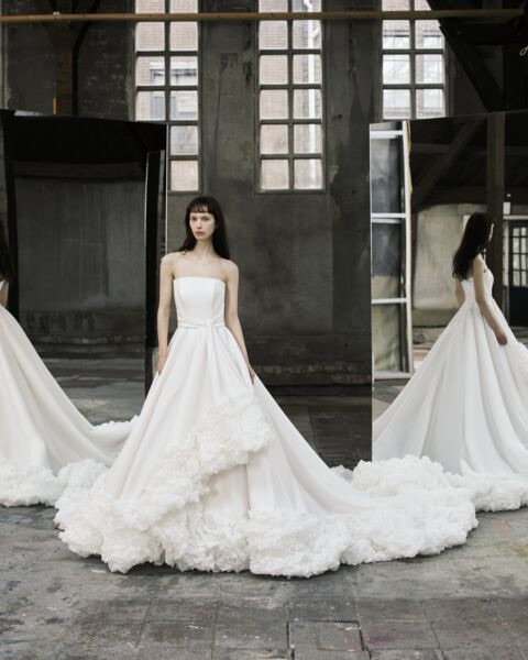 The tactile splendor is unmistakable—the textures speak a language of eloquence and sovereignty. Gowns drape in satin, mikado, Italian faille, organza, and tulle, radiating luminosity and dimensional life in motion. Among the collection’s most arresting moments are the Blushing Bouquet gowns, where florals seem to blossom from the very weave; the Couture Cloud dresses, defined by softly crinkled organza; and the Floral Devotion ballgown, which reimagines romance with a daring scoop neckline paired to a signature tulle skirt.